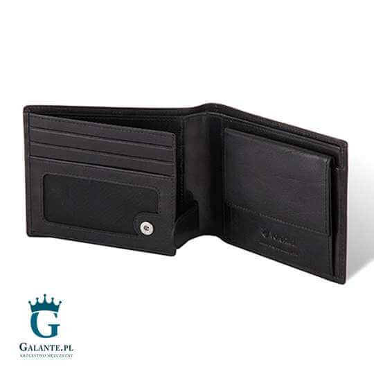 Model 152-P20 to funkcjonalny, pojemny portfel o wymiarach 12,5 cm x 9,5 cm. Występuje w klasycznym kolorze czarnym lub nasyconym ciemnym brązie. Portfel posiada: kieszeń na bilon zamykaną na zatrzask, 2 przegrody na banknoty, 6 miejsc na karty, 2 dodatkowe kieszenie oraz 2 osiatkowane okienka na dokumenty lub zdjęcie bliskiej osoby.