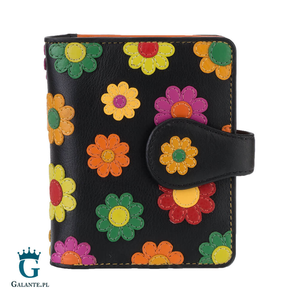Okładka portfela jest wykonana z czarnej skóry i obszyta na froncie różnokolorowymi skórzanymi kwiatkami, które dodają temu modelowi niesamowitego uroku. Portfelik jest malutki, o wysokości 11,5 cm i szerokości 9,5 cm. Główna komora portfela zamykana jest na zatrzask, którego pasek ozdobiony jest delikatnym kwiatuszkiem. W środku znajduje się przegroda na banknoty oraz 11 przegródek na karty i wizytówki, w tym jedna przezroczysta – idealna na schowanie zdjęcia najbliższej osoby. W drugiej części, która zamykana jest na zamek błyskawiczny, znajdziesz 2 przegródki na bilon czy inne drobiazgi. Cechą charakterystyczną tego portfelika jest nietuzinkowe połączenie kolorów i piękny, wykonany z precyzją wzór kwiatowy. Wykonany został ze skory naturalnej i jest bardzo miękki.