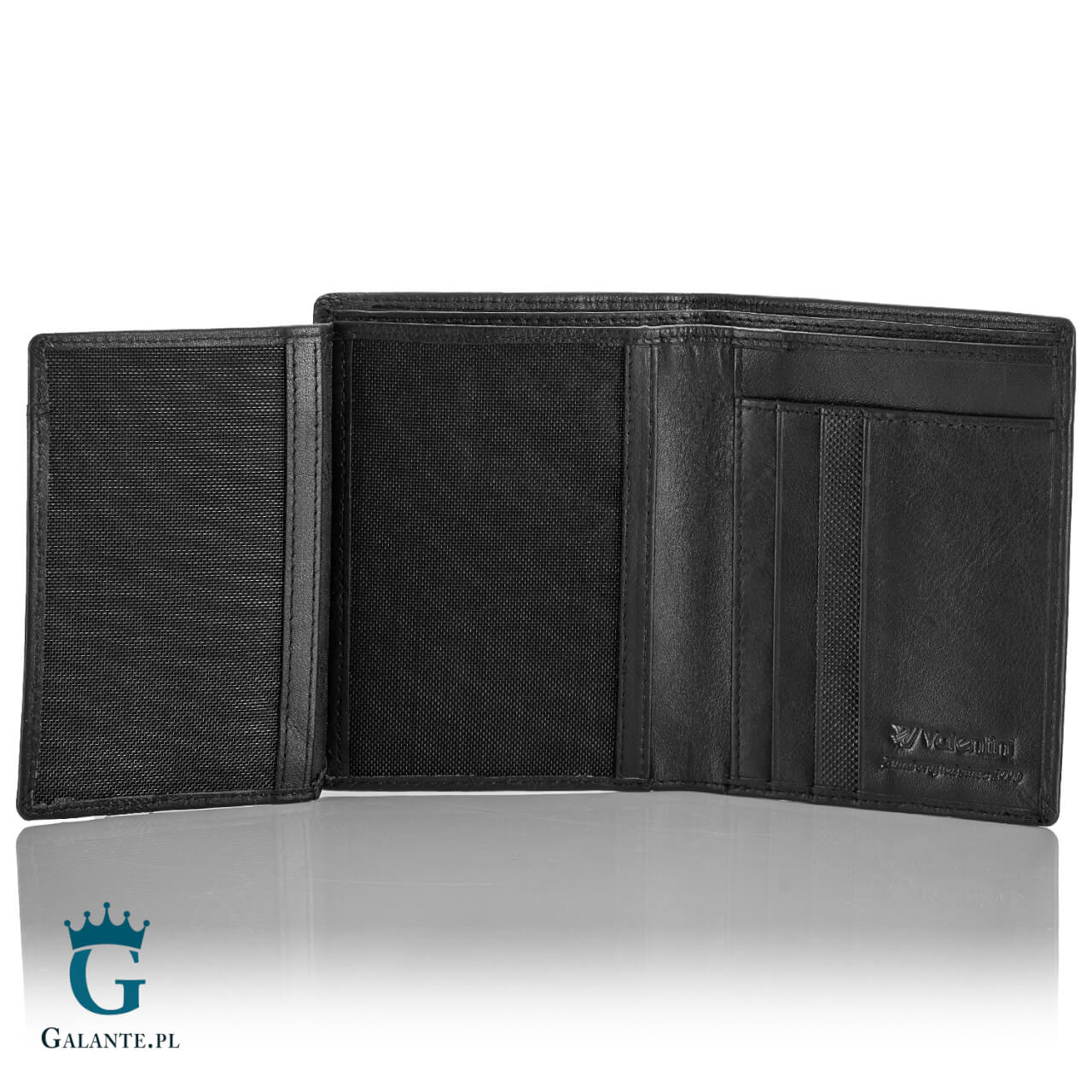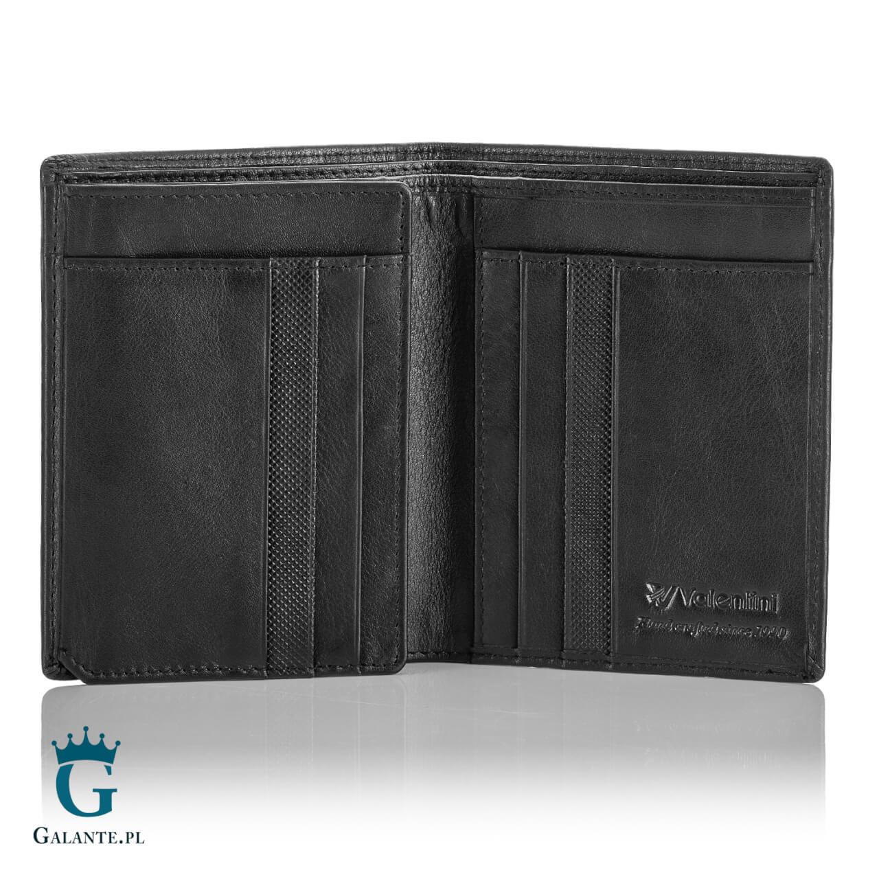 Portfel męski na karty i banknoty z renomowanej kolekcji Valentini Trophy, wykonany ze skóry naturalnej w klasycznym czarnym kolorze. Wymiary to 9,5 cm szerokości, 12,5 cm wysokości i ok. 2 cm grubości, orientacja pionowa.