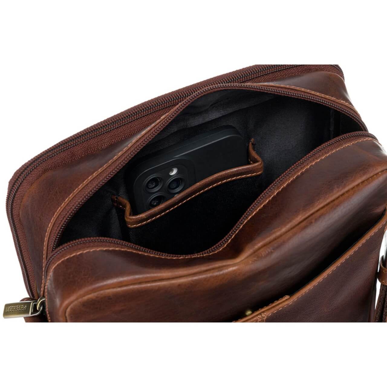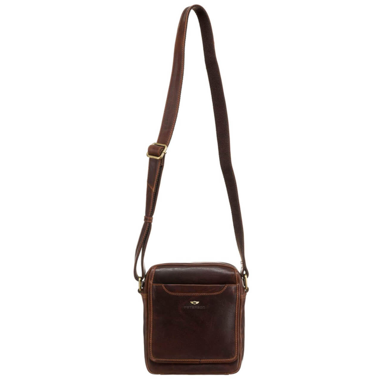 Skórzana saszetka męska PETERSON 117 to propozycja dla Panów, którzy cenią jakość i elegancję. Jest bardzo starannie uszyta z wysokogatunkowej skóry naturalnej, woskowanej i ręcznie polerowanej. Uroku dodaje jej barwienie na nasycony, ciemnobrązowy kolor oraz okucia utrzymane w kolorze starego złota. Pomieści najpotrzebniejsze rzeczy takie jak portfel, telefon czy dokumenty i sprawdzi się zarówno na spacerze w mieście, jak i w podróży do egzotycznych krajów. Przód saszetki ozdabia metalowe logo oraz tłoczenie nazwy producenta.