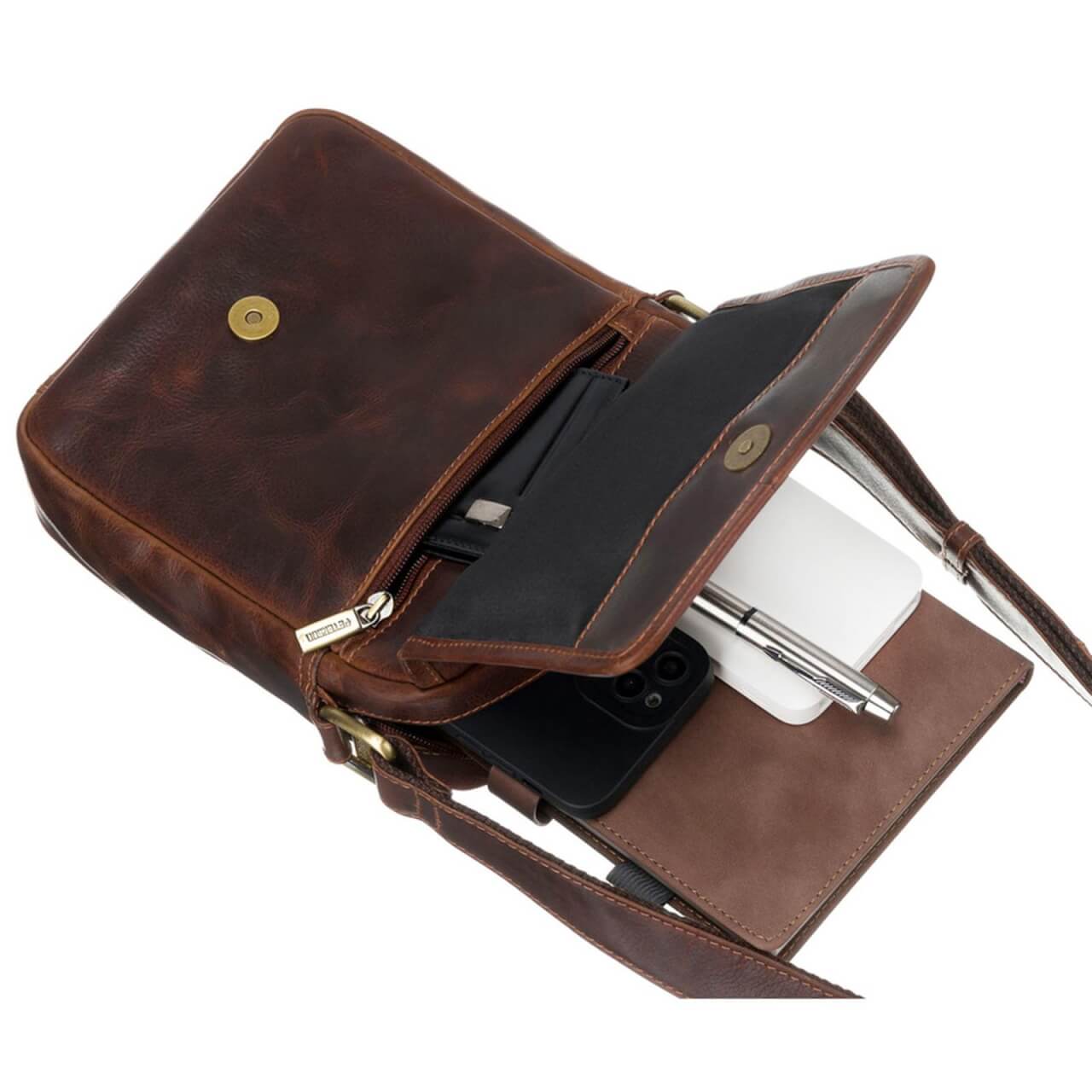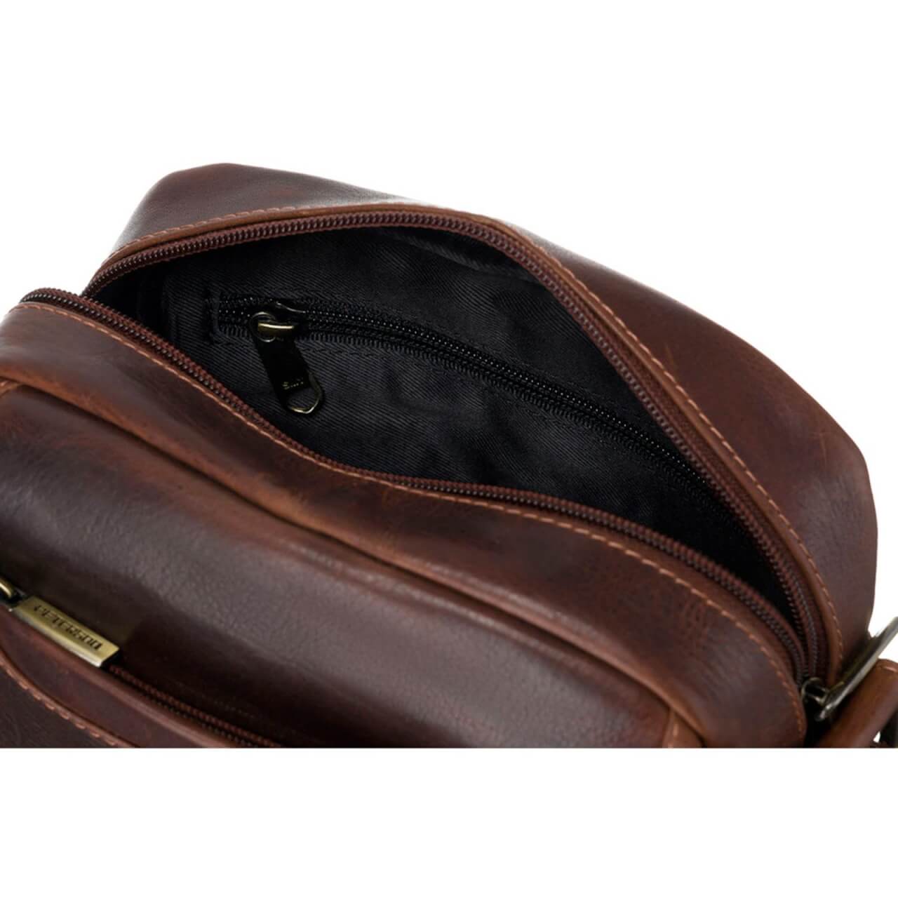 Torba jest wyposażona w skórzany pasek naramienny o długości 140 cm z możliwością regulacji długości. Posiada jedną komorę główną, zamykaną na zamek błyskawiczny i wyścieloną podszewką z mieszanki bawełnianej. W komorze znajdziemy jedną wsuwaną kieszeń na telefon oraz kieszonkę na zamek błyskawiczny – idealną do schowania niedużego portfela. Torba posiada również 2 kieszenie zewnętrzne bezpiecznie zamykane na zamek.