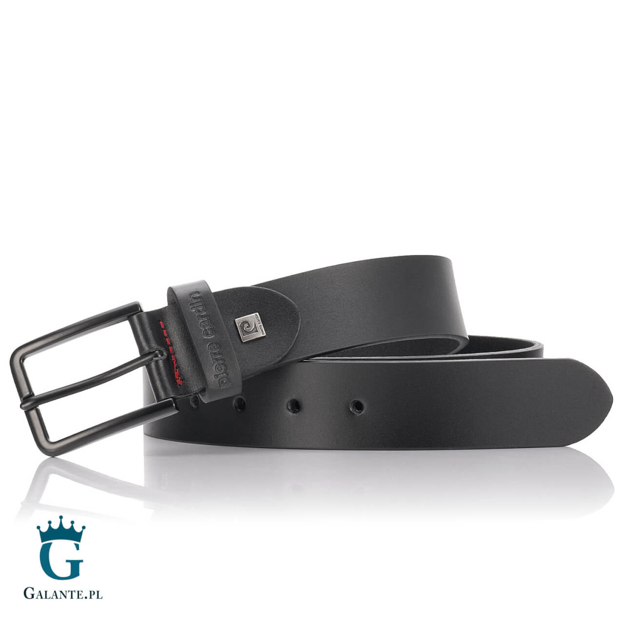Pasek posiada klamrę tradycyjną wykonaną z metalu w czarnym kolorze. Mocowanie klamry jest ozdobione kontrastującym przeszyciem czerwoną nicią oraz gustownym logo Pierre Cardin na szlufce. Wszystkie klamry pasków Pierre Cardin są wykonane ze stali o bardzo niskiej zawartości niklu, dzięki czemu nie wywołują reakcji alergicznych.