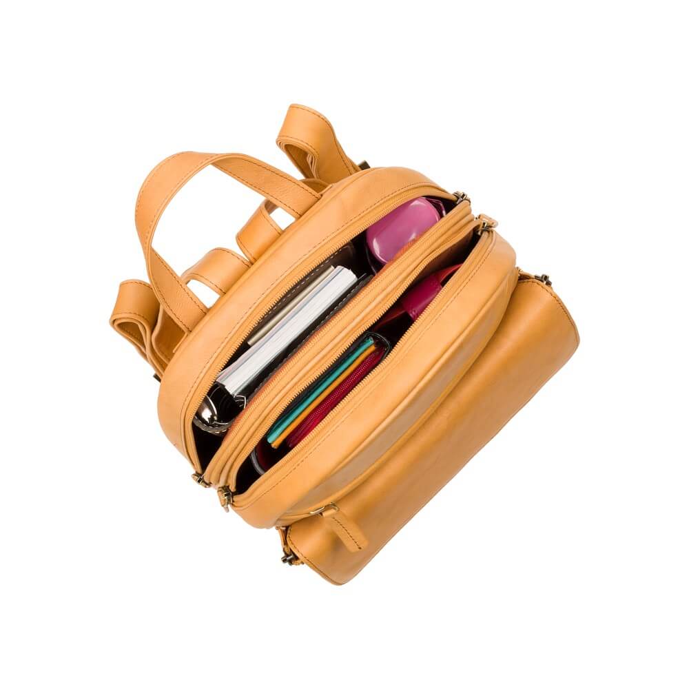 Plecak posiada skórzane paski naramienne z możliwością regulacji za pomocą eleganckich klamerek w srebrnym kolorze. Długość maksymalna to 85 cm, minimalna 75 cm. Oprócz tego ma wygodny uchwyt na rękę. Plecak posiada dwie komory zamykane na zamek błyskawiczny. Jedna z nich jest dodatkowo wyposażona w “bezpieczną” kieszonkę zamykaną na zamek. Z przodu znajdziemy dużą płaską kieszeń zamykaną na zamek oraz szeroką kieszeń z klapą i zapięciem magnetycznym – oraz dodatkowymi zameczkami z boków, które ułatwiają “pełny” dostęp do kieszeni. W szerokiej kieszeni znajduje się organizer z kieszonką na telefon, 5 miejscami na wizytówki oraz miejscem na długopis.