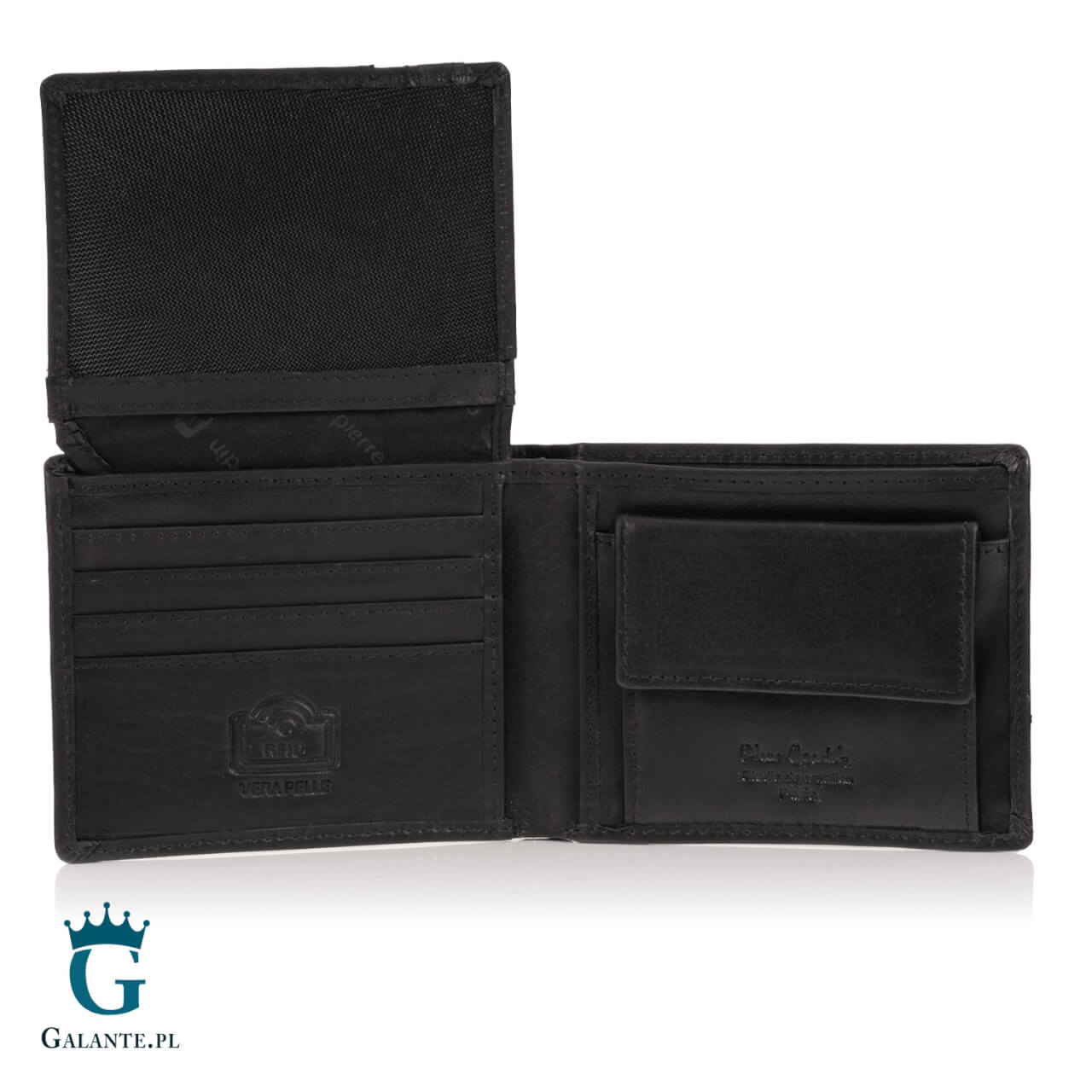 Praktyczny, stylowy i wytrzymały – oto cechy charakterystyczne prezentowanego portfela francuskiej marki Pierre Cardin. Portfel jest wykonany z gładkiej, matowej skóry naturalnej w klasycznym czarnym kolorze. Okładkę ozdabia eleganckie metalowe logo producenta w srebrnym kolorze. Wymiary portfela to 9 x 11 cm, orientacja pozioma. Portfel posiada: