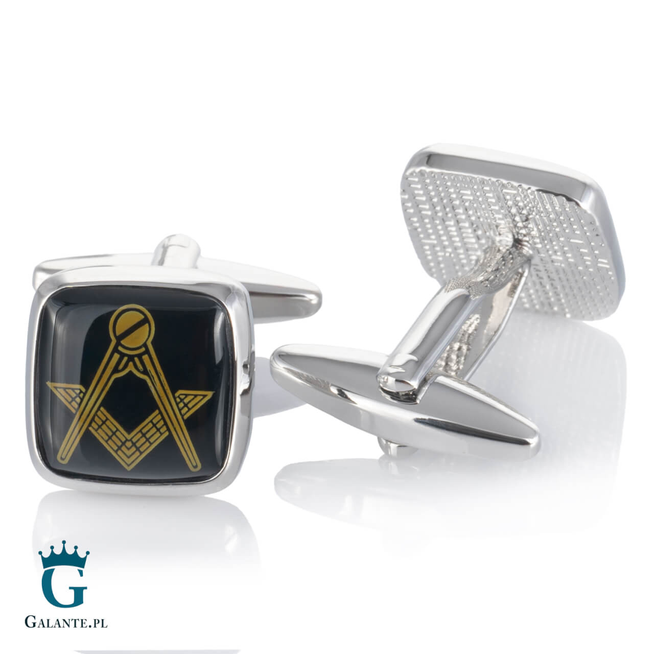 Spinki do mankietów z symbolem cyrkla i węglicy, reprezentującym tajemniczy i wpływowy związek wolnomularski. Złoty znak na czarnej podstawie, wykonanej z onyksu sprawiają, że jest to niezwykle elegancki komplet, który świetnie pasuje do ciemnych garniturów i białych koszul. Spinki są wykonane ze stali szlachetnej w srebrnym kolorze, pokrytym dodatkowo warstwą nieaktywnego rodu, który zabezpiecza kolor i ma właściwości antyalergiczne. To wspaniały dodatek do stroju dla każdego członka loży masońskiej.