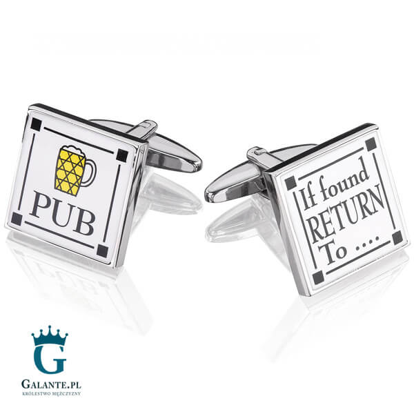 Szykuje się męski wieczór w barze przy piwie, może dwóch, ewentualnie pięciu…? Dzięki spinkom do mankietów nawet elegancka koszula nabierze luźniejszego charakteru, odpowiedniego na spotkanie towarzyskie. Mowa tutaj oczywiście nie o zwyczajnych spinkach, lecz o takich z zabawnym napisem „If found return to PUB” – „W razie znalezienia zwrócić do pubu” i grafiką przedstawiającą kufel piwa. Te kwadratowe spinki do mankietów wykonane ze stali szlachetnej sprawią, że zabłyśniesz w towarzystwie i rozbawisz przyjaciół i znajomych! Są oryginalnym pomysłem na upominek dla piwosza.