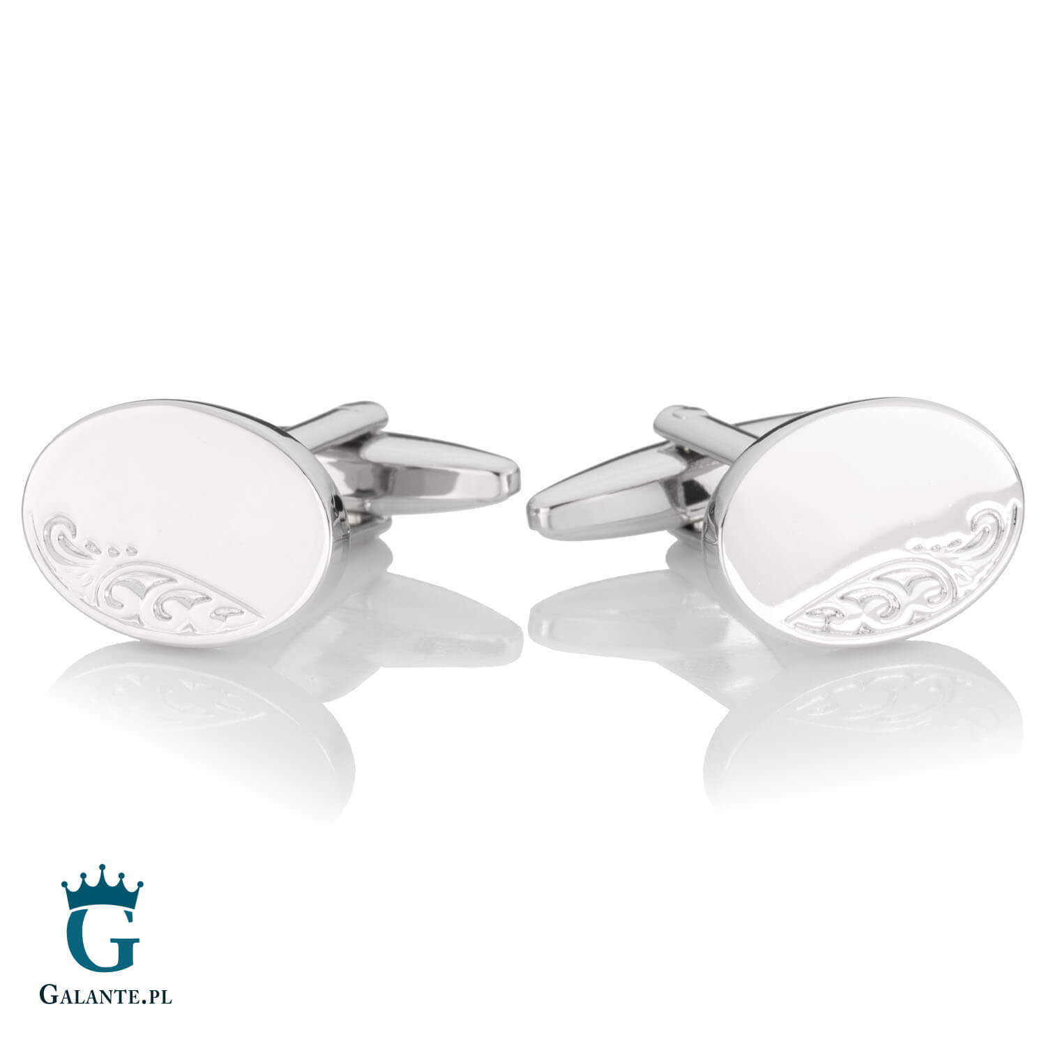 Owalne spinki do mankietów wykonane ze stali szlachetnej w srebrnym kolorze, wykończone na połysk i ozdobione delikatnym, kwiatowym wzorem, to kwintesencja elegancji i uroku. Bardzo ozdobne a równocześnie minimalistyczne, przypadną do gustu Panom ceniących klasyczną biżuterię bez nadmiernego przepychu. Sprawdzą się jako dodatek do stroju podczas każdej uroczystej okazji – niezależnie czy jest to wieczorny koncert, firmowa gala lub świąteczne spotkanie z rodziną. Mogą również z powodzeniem ozdobić mankiety damskich koszul.