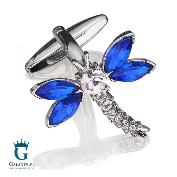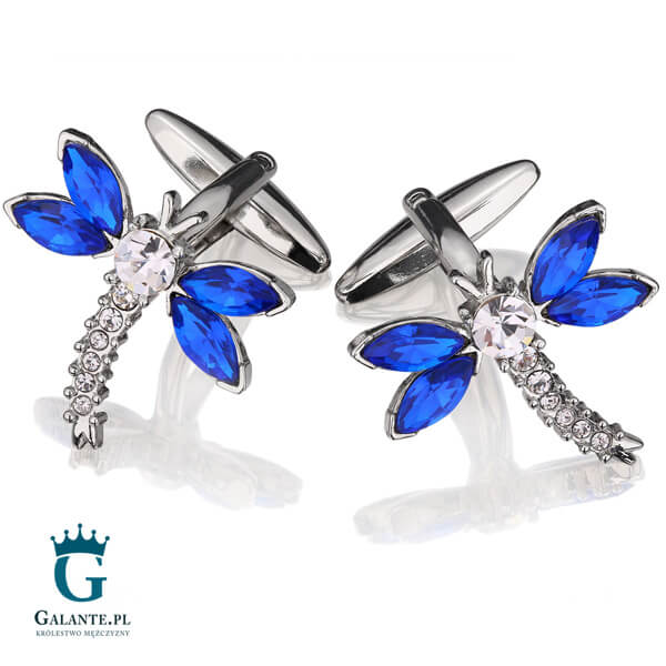 Spinki do mankietów w kształcie pięknych ważek – odpowiednie zarówno do męskiej, jak i damskiej koszuli. Te spinki do koszuli w wersji unisex wyglądają bardzo efektownie i lśnią wspaniałym blaskiem w promieniach słońca, a to dzięki niebieskim i przezroczystym cyrkoniom. Ekskluzywny design sprawia, że doskonale prezentują się w najbardziej eleganckich stylizacjach. Stal szlachetna, którą wykorzystano do stworzenia tych spinek jest metalem antyalergicznym, a dodatkowo nie czernieje i na długo zachowuje połysk.
