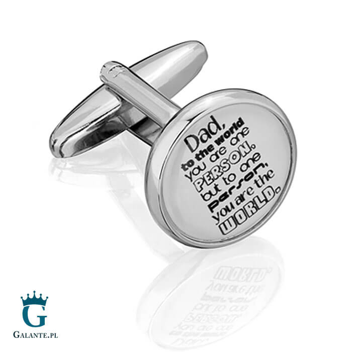 Spinki do mankietów dla taty są produktem wysokiej jakości – wykonane zostały ze stali szlachetnej i mają kolor srebrny za wyjątkiem tarczy, która jest wytworzona z masy jubilerskiej i posiada napis „Dad, to the world you are one person, but to one person, you are the world” (Tato, dla całego świata jesteś jedną osobą, ale dla jednej osoby jesteś całym światem). Spinki ładnie dopasowują się do mankietów i – co ważne – będą odpowiednie zarówno do stylizacji klasycznych, jak i casualowych.