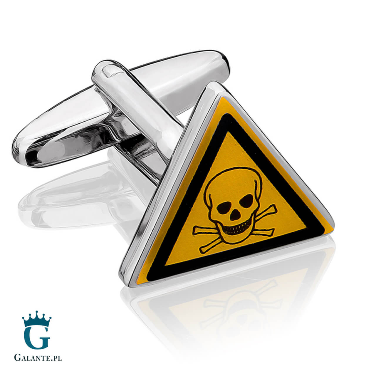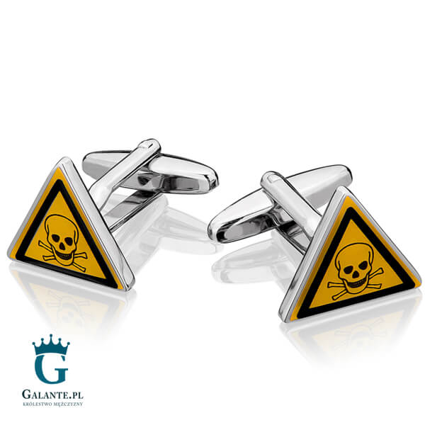 Uwaga! Substancja toksyczna! Na szczęście to nie realne zagrożenie, a jedynie nasze niecodzienne trójkątne spinki do mankietów w postaci miniaturowych tablic ostrzegawczych. Żółte spinki do mankietów z pewnością przyciągną wzrok otoczenia. Wykonane z wysokiej jakości stali szlachetnej i masy jubilerskiej. Nie uczulają i na długo zachowują połysk. Spinki – znaki ostrzegawcze “Substancja toksyczna” z motywem czaszek to oryginalny pomysł na prezent dla panów związanych zawodowo z dziedziną BHP lub pracujących w laboratoriach.