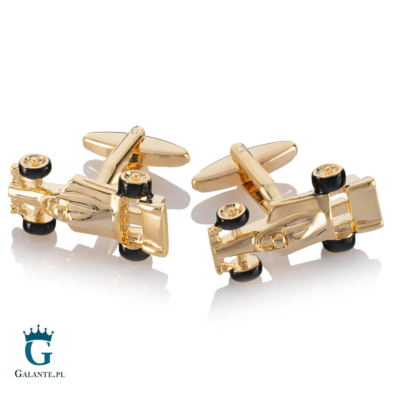 Spinki są wykonane ze stali nierdzewnej w złotym kolorze, z czarnymi oponami bolidów. Idealnie wykończą elegancką stylizację ślubną lub biznesową. Świetnie wyglądają zarówno na mankietach białej jak i ciemnej koszuli.