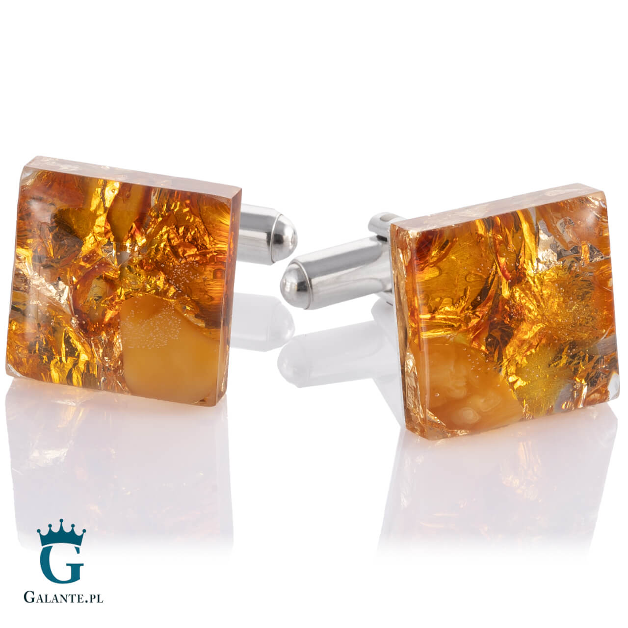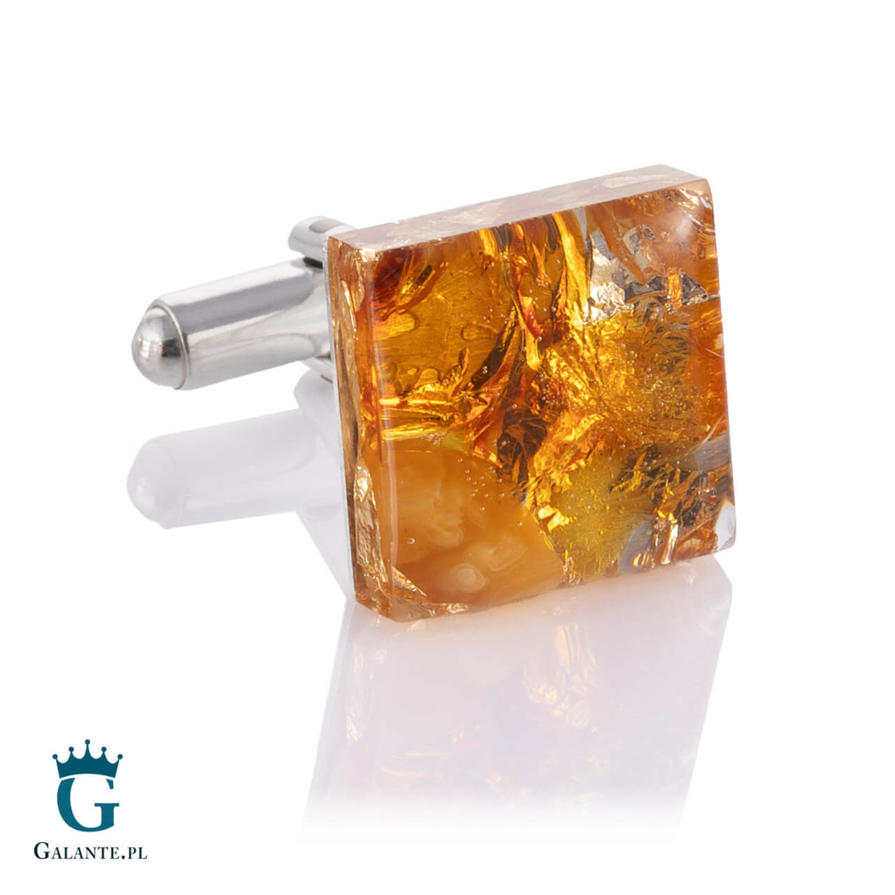 Złote płatki i koniakowe bursztyny zatopione w przejrzystej żywicy tworzą wytworną całość godną największego eleganta. Oto nasze niepowtarzalne spinki do mankietów wykonane ręcznie w pracowni na Śląsku. Każda para jest wyjątkowa i jedyna w swoim rodzaju. Bursztyny w towarzystwie srebra pr. 925 mają nieodparty urok i na pewno rozkochają w sobie niejednego miłośnika natury.