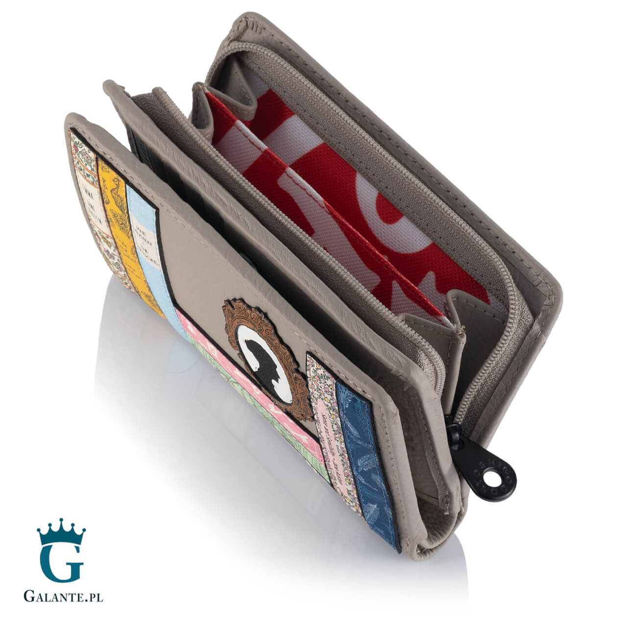 Oto portfel dla koneserki klasyki literackiej. Nieduży, wykonany z wysokiej jakości skóry naturalnej barwionej na ciepły, szary kolor, został ozdobiony naszywką przedstawiającą książki Jane Austen – autorki znanej chyba każdemu choćby z nazwiska. Powieści takie jak Duma i Uprzedzenie, Rozważna i Romantyczna czy Mansfield Park były wielokrotnie ekranizowane i – choć osadzone w klimacie XIX-wiecznej Anglii – do dziś nie straciły uroku.