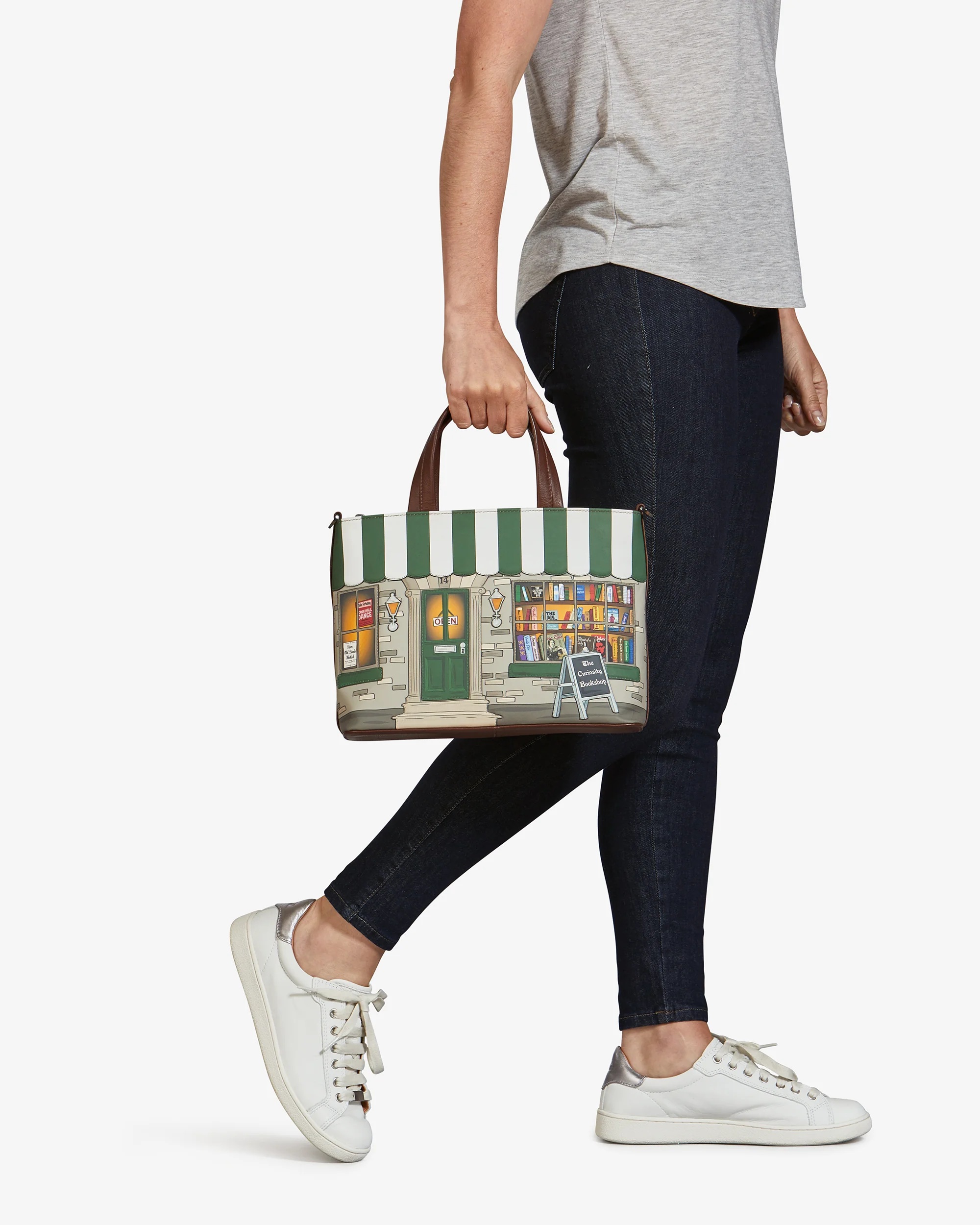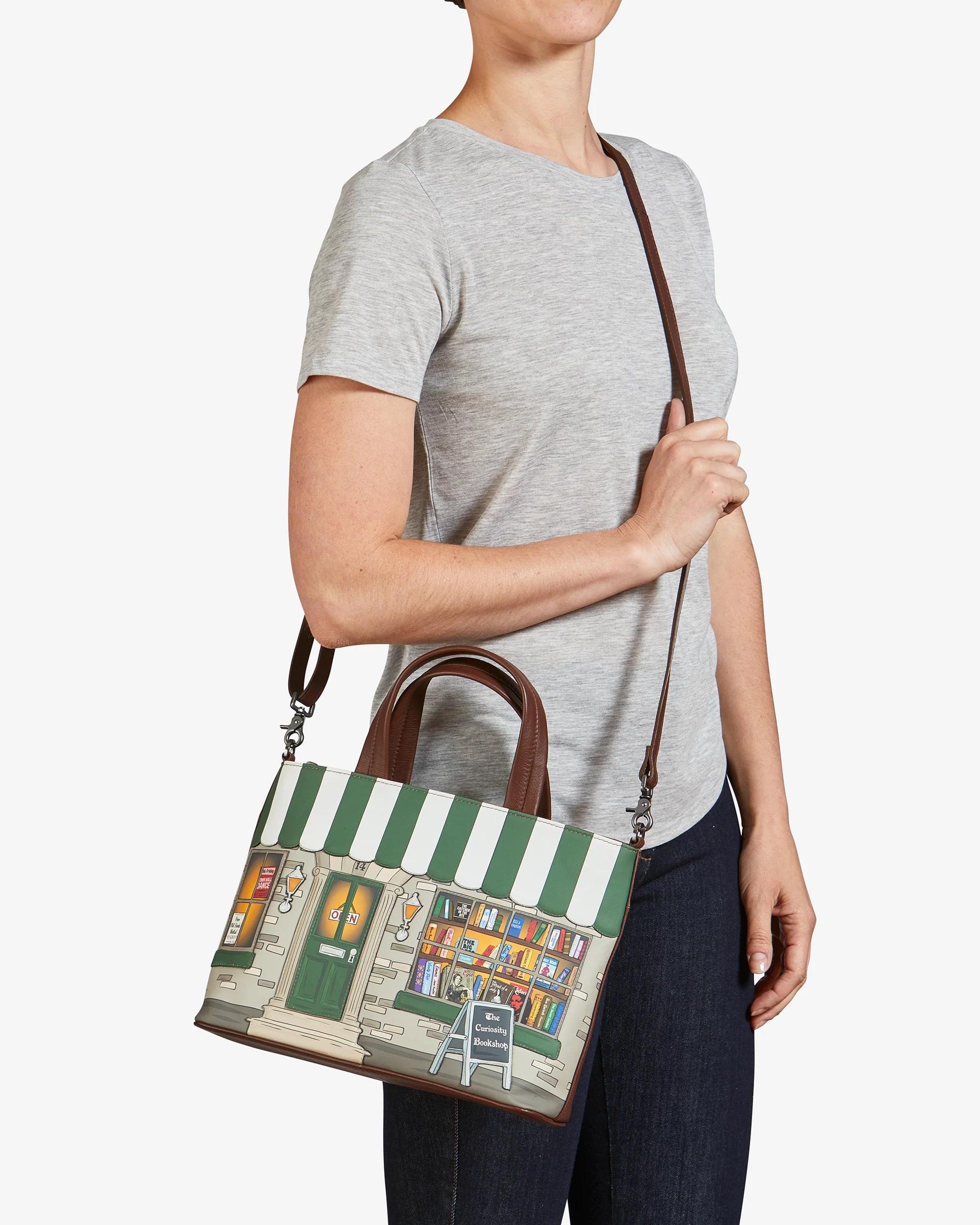 Nieduża shopperka z kolekcji “Antykwariat” brytyjskiej marki Yoshi spodoba się miłośniczkom oryginalnych dodatków galanteryjnych w stylu vintage. Wykonana ze skóry naturalnej w kolorze brązowym i zielonym, na okładce jest ozdobiona bardzo szczegółowo wykonanym wzorem przedstawiającym stary antykwariat z witryną zasypaną książkami i rozświetloną ciepłym złotym światłem. Czarujący obrazek w stylu retro nadaje tej kolekcji niepowtarzalnego uroku.