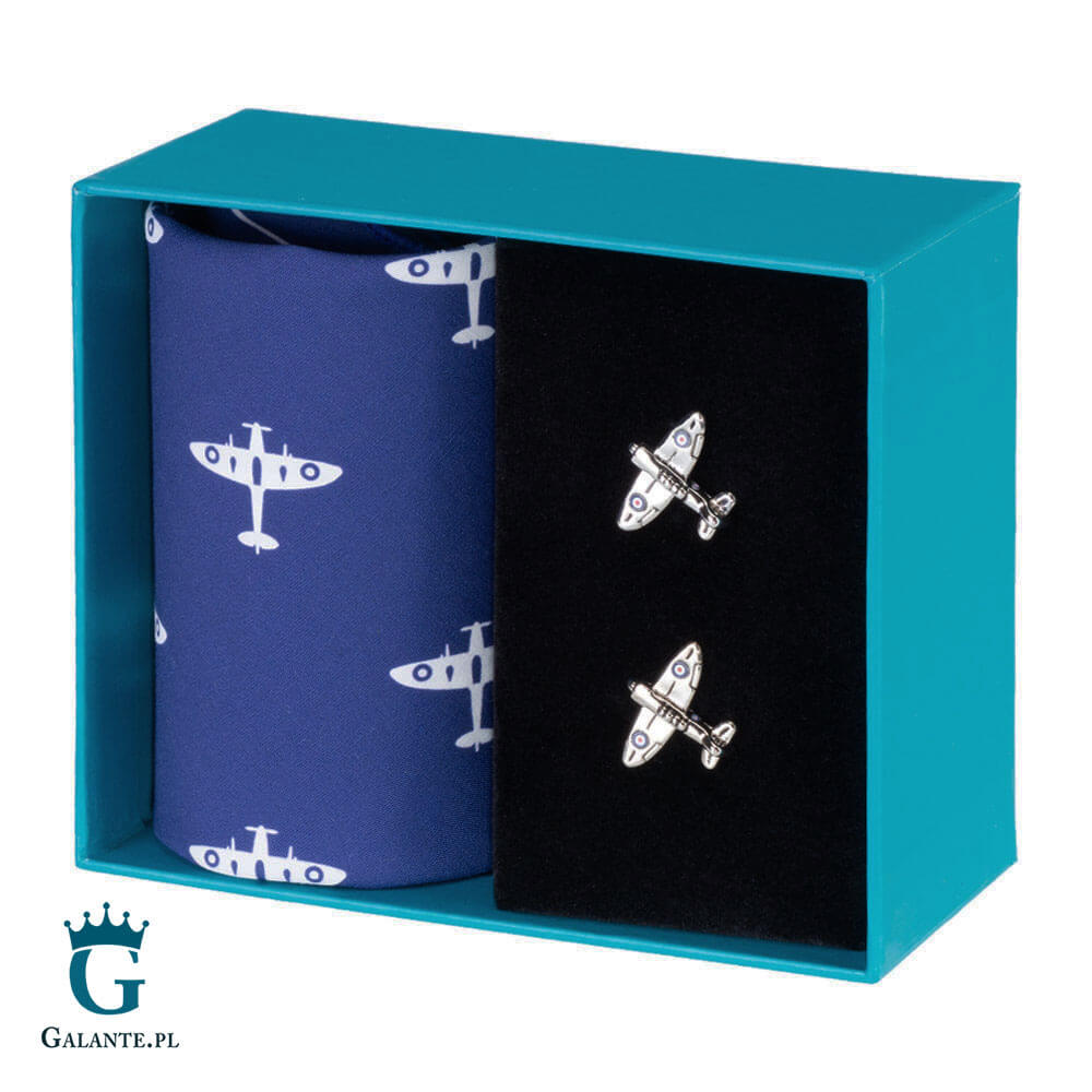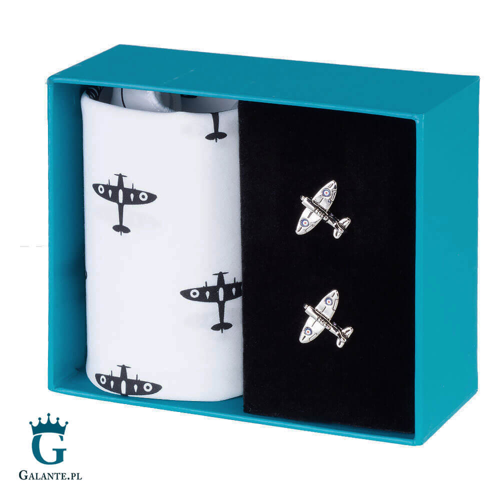 W zestawie znajdują się spinki do mankietów wykonane ze stali szlachetnej w kształcie słynnych samolotów brytyjskiego lotnictwa Spitfire oraz chusteczki ze 100% bawełny z podobnym nadrukiem. Takie oryginalne dodatki do stroju podbiją serce każdego mężczyzny o militarnych lub lotniczych zainteresowaniach!