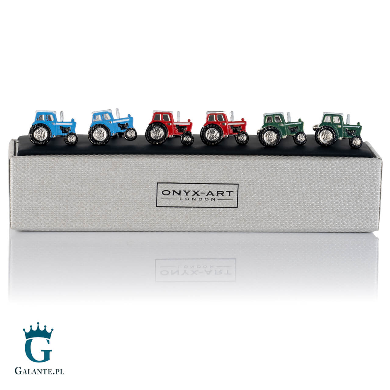 Wymiary spinek to 22 mm szerokości i 16 mm wysokości oraz ok. 3 mm grubości. Traktory są w kolorze niebieskim, czerwonym i zielonym. Wykonane z niezwykłą starannością, z pewnością podbiją serce obdarowanego mężczyzny.