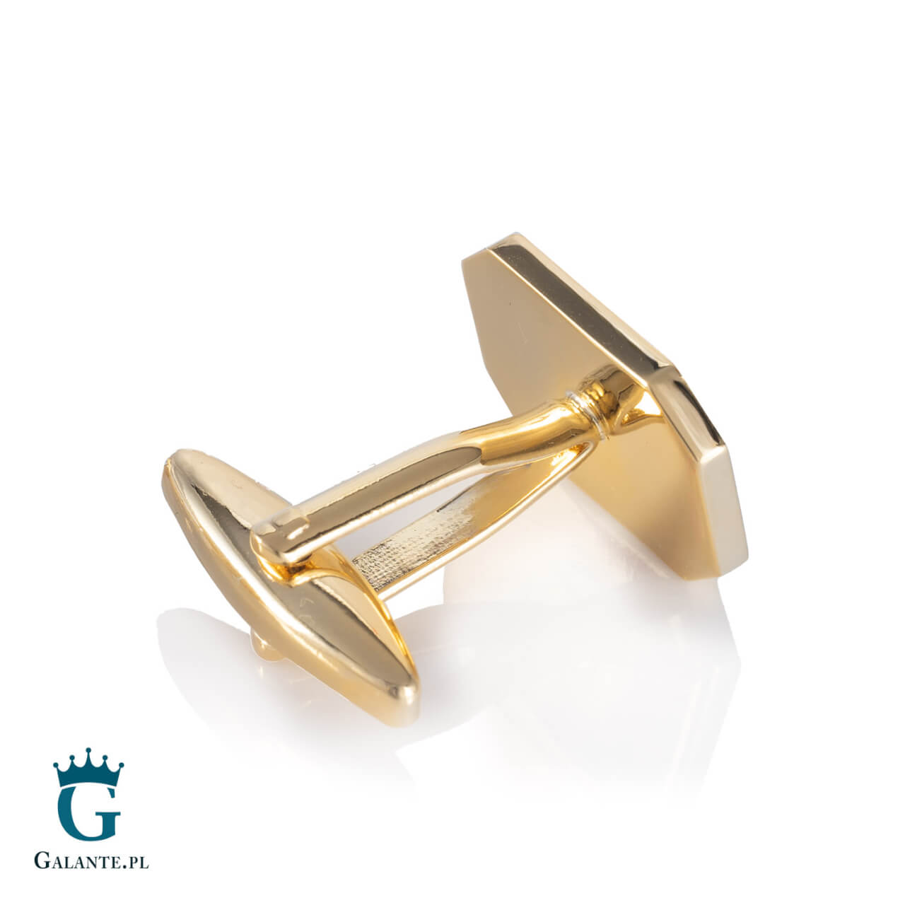 Klasyczne, sześciokątne spinki do mankietów w złotym kolorze, wykonane ze stali szlachetnej pokrytej galwaniczną warstwą zapewniającą trwałość barwy oraz właściwości antyalergiczne. Wykończone na połysk, spodobają się Panom, którzy cenią proste i minimalistyczne dodatki do eleganckiego stroju. Idealnie pasują do każdej uroczystej stylizacji.
